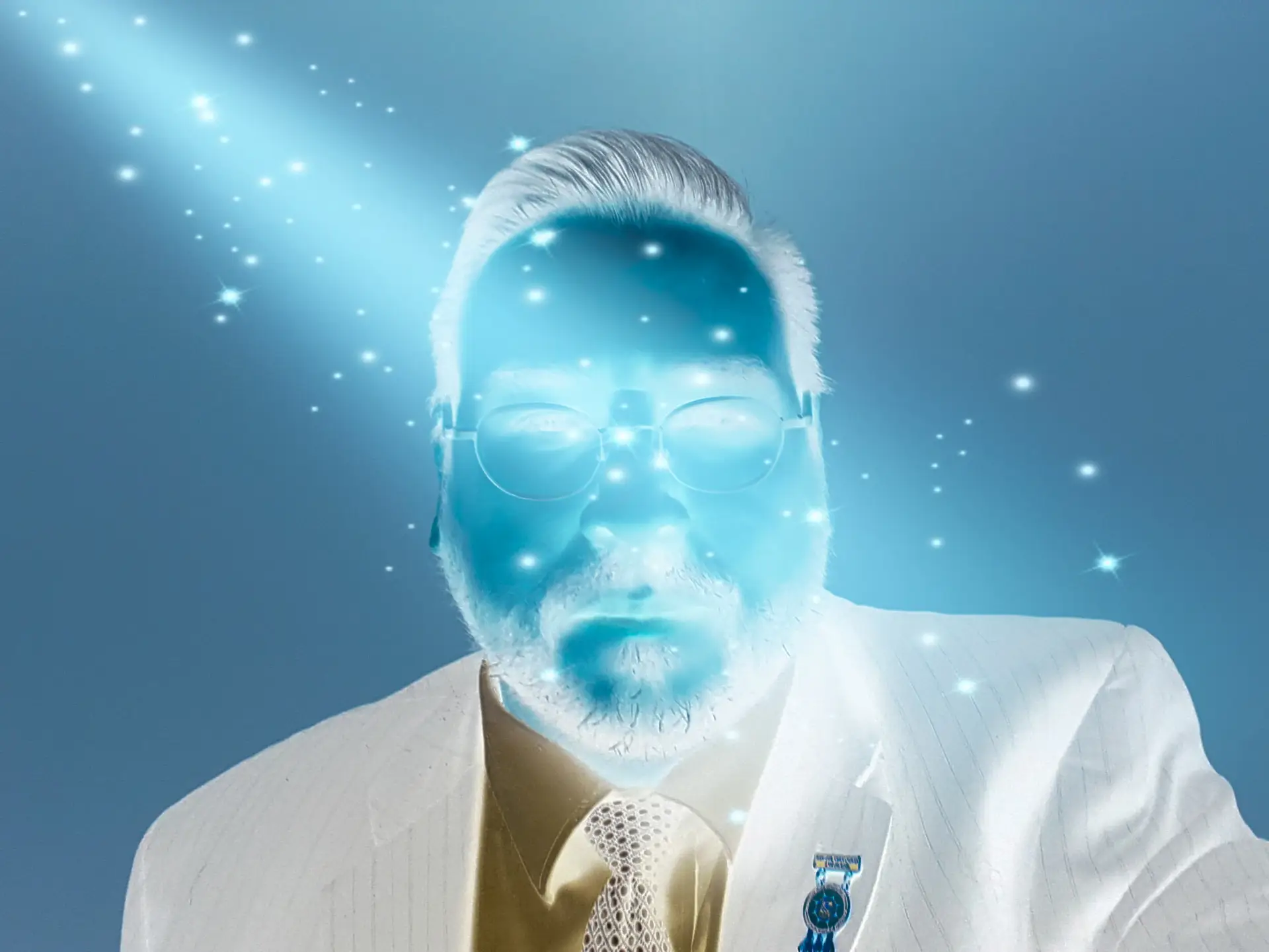 A luminous self-portrait in which the artist appears bathed in celestial blue-white light, their features dissolved into radiance while scattered stars drift through the surrounding space. The formal white suit grounds the composition in dignity and presence, while the glowing overlay speaks to the interior life of the creative mind and the inner light that drives an artist to make, to share, and to be seen on their own terms. Printed on archival paper with pigment inks, this work is produced in a limited edition and arrives hand-signed with a certificate of authenticity. A deeply personal and visually arresting work that invites the viewer to consider what it means to truly see another person and to be seen.